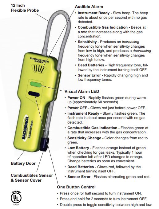 Measuring only 6 inches in length with a 12-inch flexible probe, Bacharach's Leakator Jr. is a low maintenance, easy-to-use portable combustible gas leak detector that is capable of pinpointing large and small leaks quickly with absolutely no calibration required. The Leakator Jr. is ideal for pinpointing combustible gas leaks; testing appliances in commercial, residential, and industrial applications; surveying gas pipelines; and inspecting valves, regulators, and meters on gas equipment.